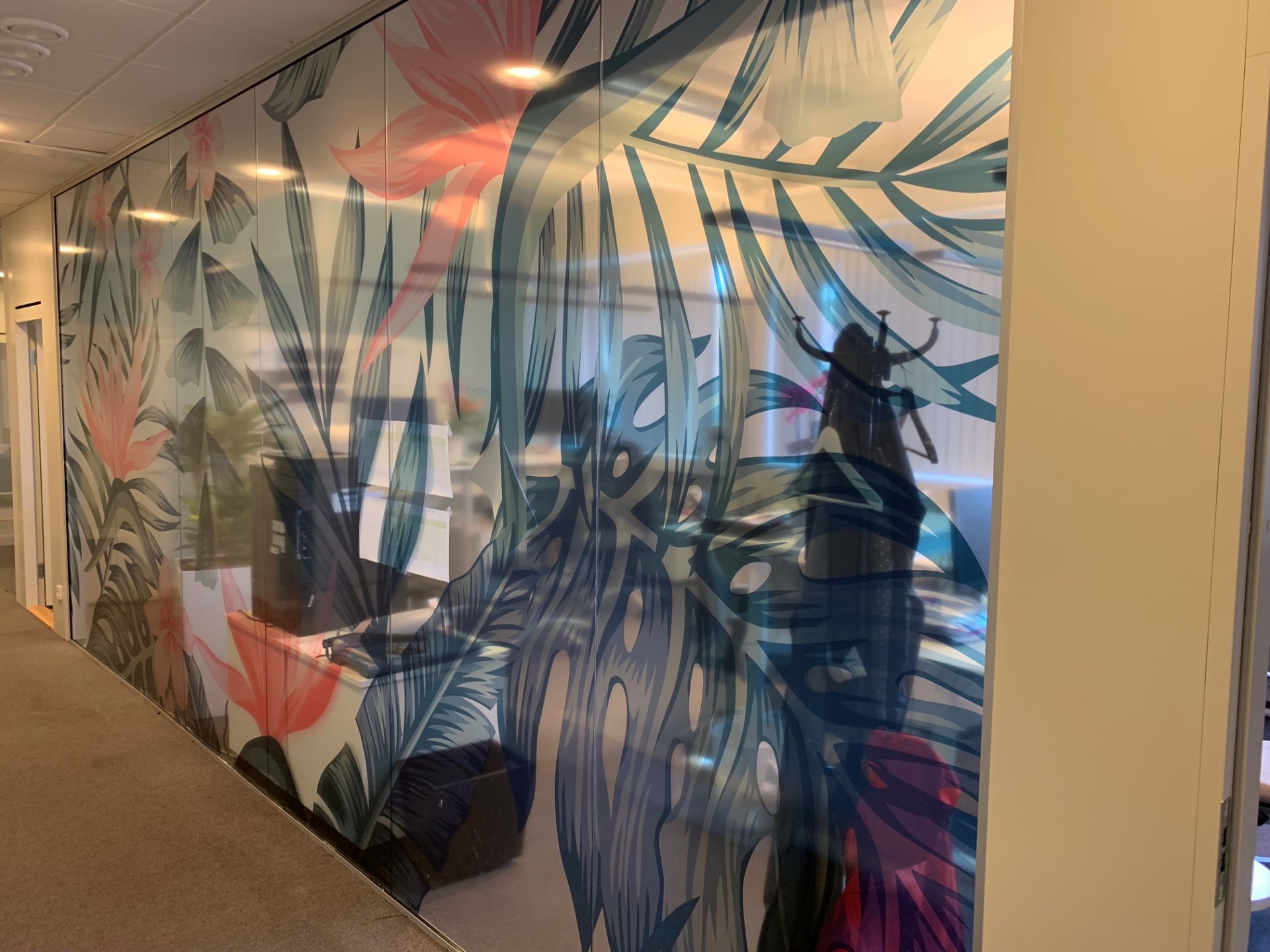 Glasdekor i frostfolie/frostfilm med mönster/logo eller heltäckt för insynsskydd till butiksfönster eller kontor.
